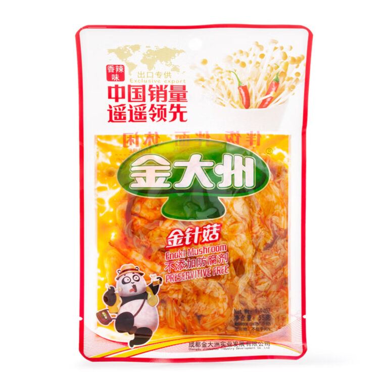 Details Made In:Mainland China Unit Qty:55 g Brand:Jin Da Zhou Allergens: Soy. Description Spicy Enoki Mushroom 55 g